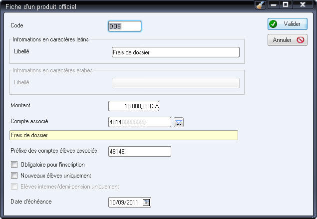 fenêtre ci-dessous permet de définir les frais de scolarité pour chaque couple